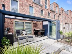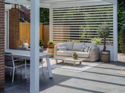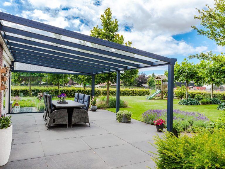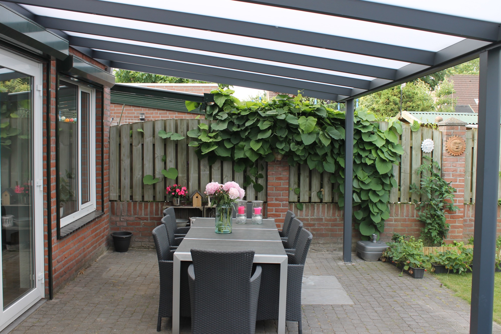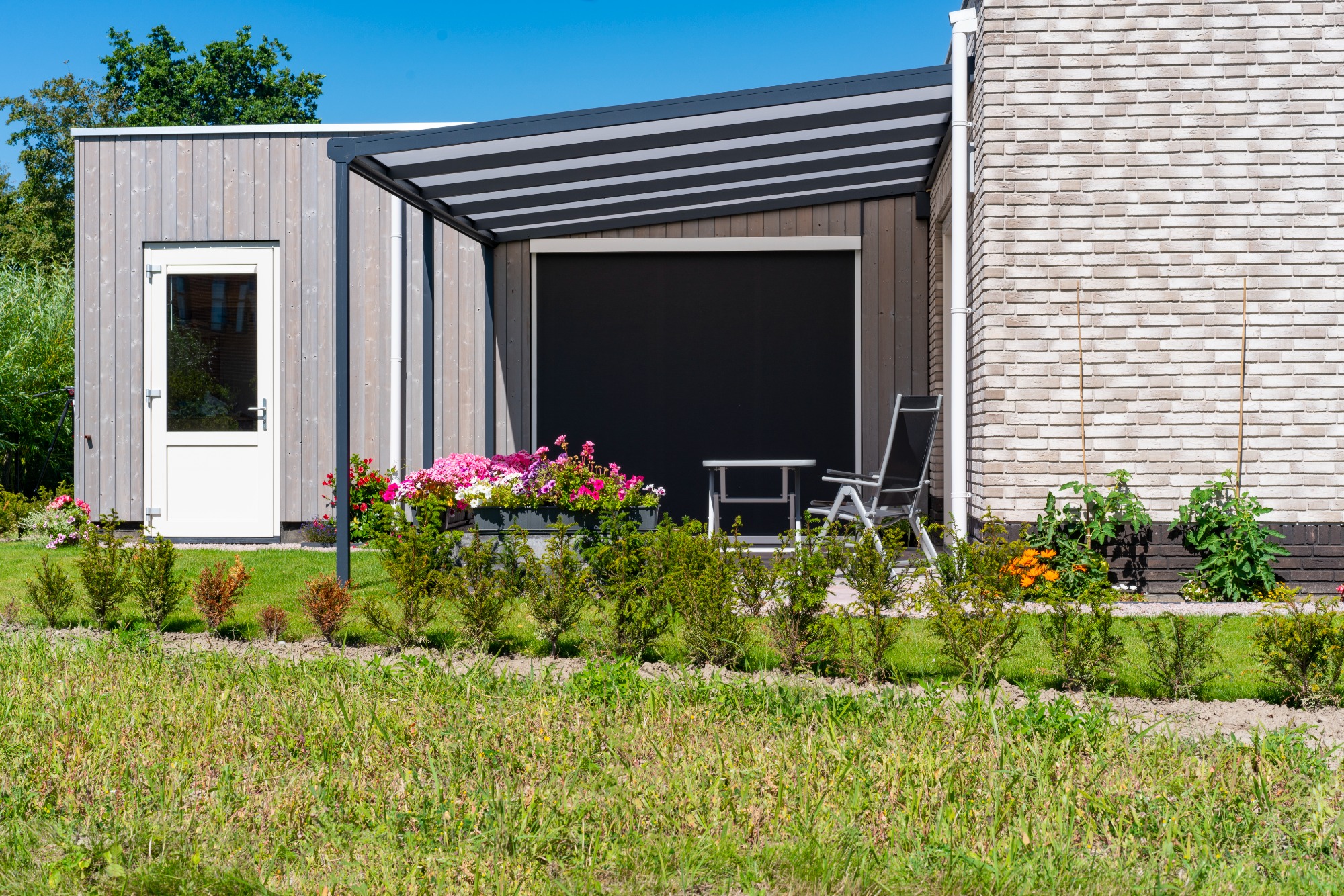 The detached terrace canopy Ribolla is an entirely independent construction. Because of that, you are not bound by placement against a façade, meaning that you can enjoy a covered terrace in any place in your garden. The highest point of the Ribolla is at the front, this means that the drain and the gutter are at the back of the roof, so that it maintains a smooth and open appearance.